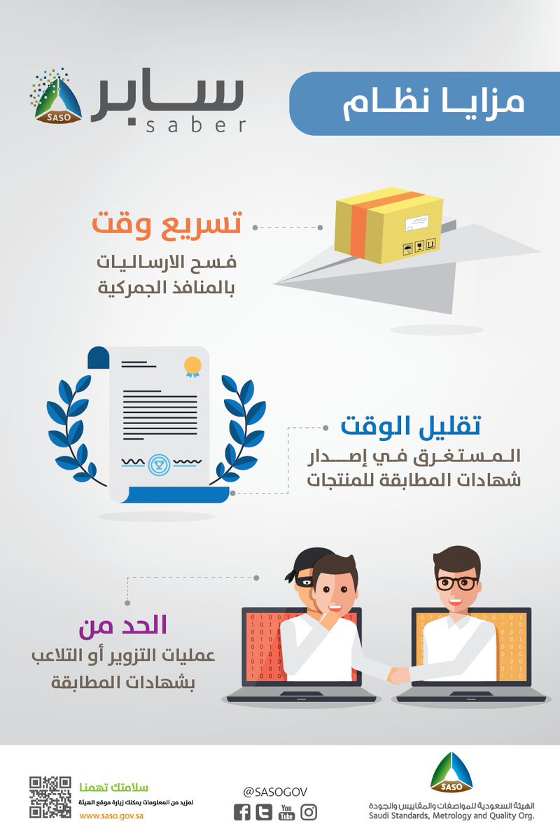 المواصفات السعودية Twitterissa نظام Sabergov سيساعد على تسريع الإجراءات تقليل وقت فسح البضائع وإصدار شهادات المطابقة الحد من عمليات التزوير والتلاعب في شهادات المطابقة هيئة المواصفات سلامتك تهمنا Https T Co Di5ku42ixh