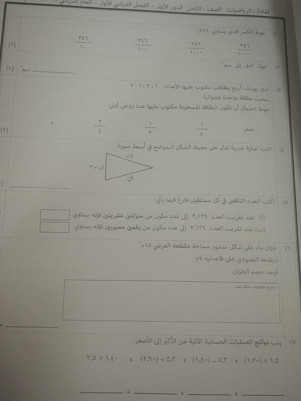 الإجابة النموذجية اسئلة اختبار الرياضيات الصف الثامن الفصل الأول 2020