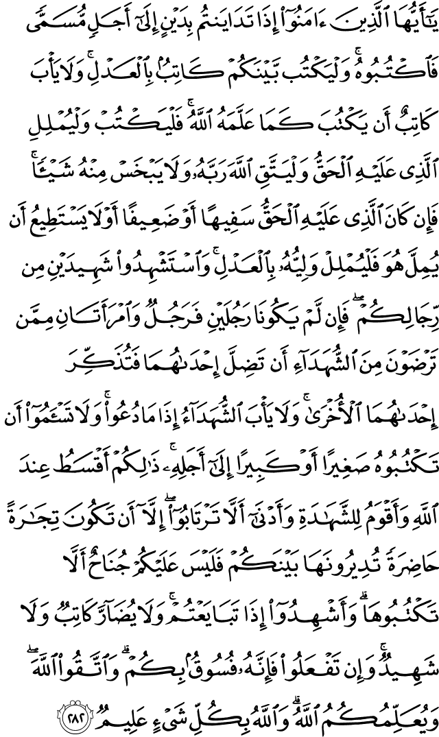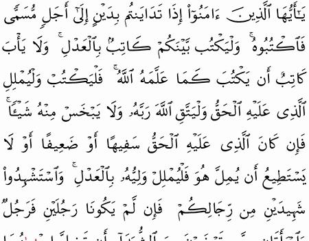 ي ا أ ي ه ا ال ذ ين آم ن وا إ ذ ا ت د اي ن ت م ب د ي ن إ ل ى أ ج ل م س م ى ف اك ت ب وه و ل ي ك ت ب ب ي ن ك م ك ات ب ب ال ع د ل و ل ا ي أ ب ك ات ب أ ن ي ك ت ب ك م ا ع ل م ه الل ه ف ل ي ك ت ب و ل ي م ل ل ال ذ ي ع ل ي ه ال ح ق