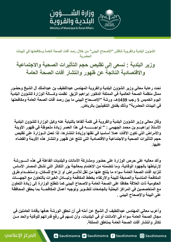 وزارة الشؤون البلدية والقروية A Twitter وزارة الشؤون البلدية والقروية تناقش الإصحاح البيئي من خلال رصد آفات الصحة العامة ومكافحتها في البيئات الحضرية وزير الشؤون البلدية والقروية نسعى إلى تقليص حجم التأثيرات الصحية والاجتماعية والاقتصادية