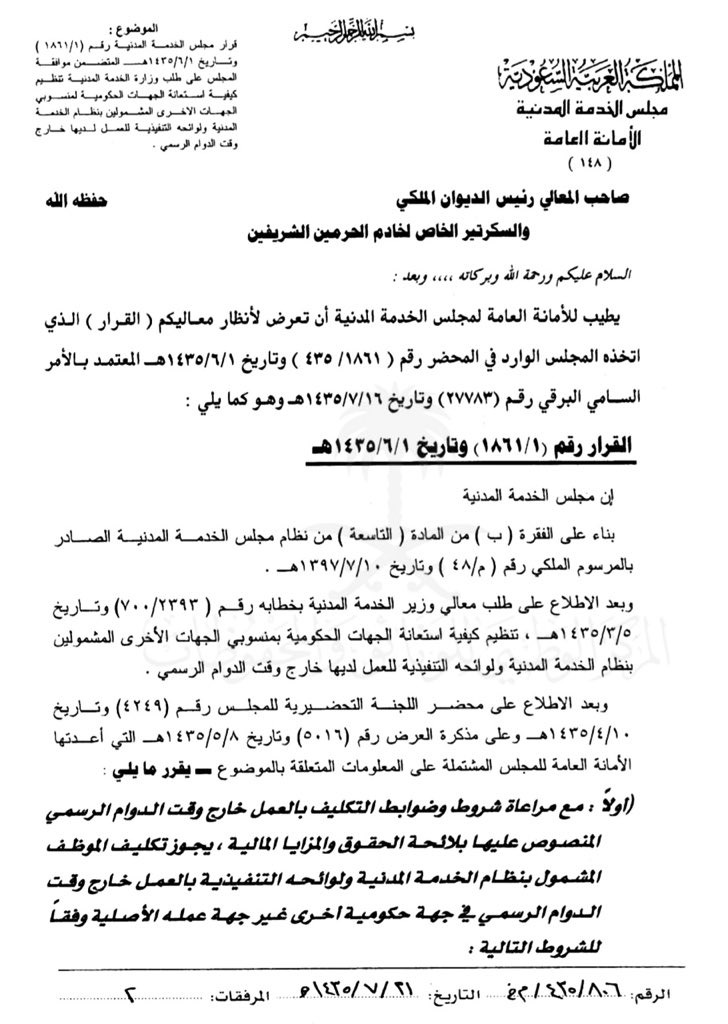 بوابة الموظفين نعود بحذر Twitterissa التكليف بالعمل الاضافي خارج الجهة صورة من القرار رقم 1861 1 وتاريخ 1435 6 1هـ بخصوص السماح بتكليف الموظف بالعمل خارج وقت الدوام أو الانتداب في جهة حكومية أخرى بشروط منها موافقة الموظف ويصرف استحقاقه
