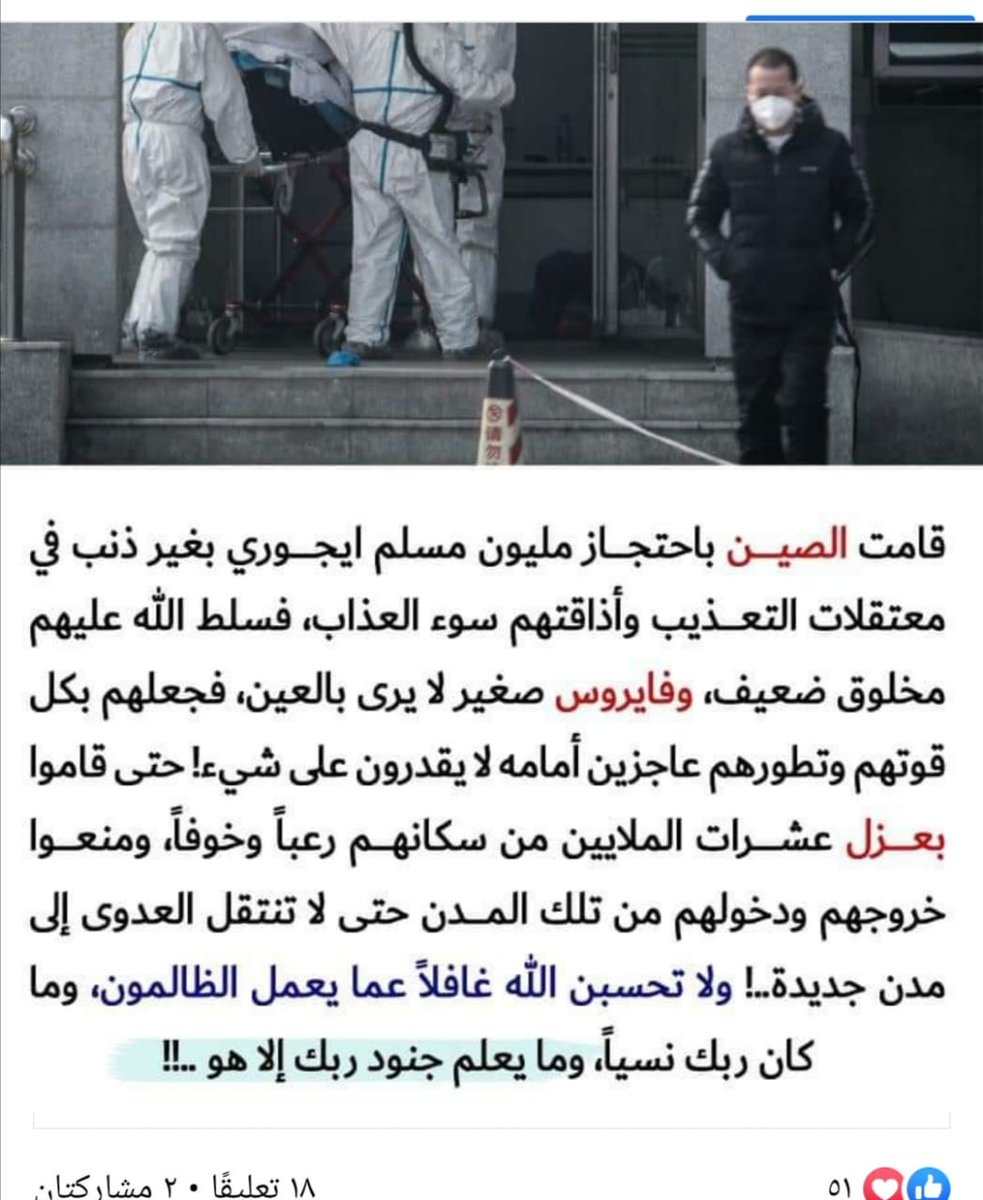 فهد الحميد V Twitter عزلت الصين مليون مسلم من الايغور واليوم الصين تعزل 18مليون وما ربك بظلام للعبيد فأرسل اللهﷻجندي واحد فقط من جنوده الذين لا يحصون وما يعلم جنود ربك إلا هو فيروس كورونا لا